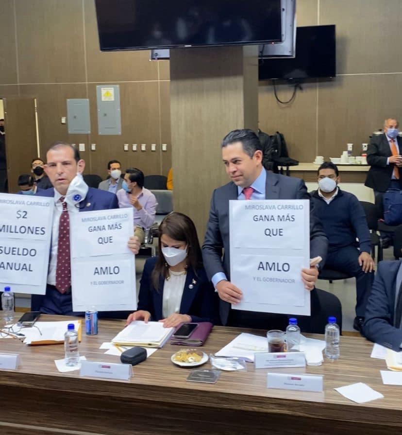 En la imagen Guillermo Zamacona Urquiza, diputado del PRI y Paco Santos, legislador del PAN, se observa con pancartas donde la acusan de ganar un salario de dos millones de pesos anuales, que superan lo que percibe López Obrador, algo incongruente con las características que dibuja el tabasqueño sobre lo que debe ser el ejercicio público.