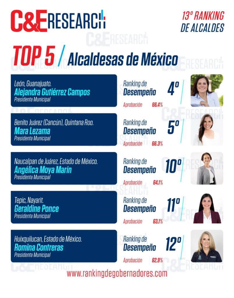 Por la derecha: De acuerdo con la empresa Campaigns and Elections, de las cinco presidentas municipales con mayor porcentaje de desempeño del país; dos son mexiquenses; Romina Contreras, de Huixquilucan y Angélica Moya Marín, de Naucalpan.