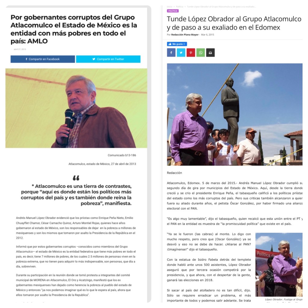 Incluso durante sus pasadas visitas a Atlacomulco, antes de ser presidente de la República, López Obrador criticó – estando a un lado de la estatua de Isidro Fabela- al mítico Grupo Atlacomulco, cuyo referente es Isidro Fabela, además ha dicho que los ex gobernadores corruptos del estado de México contribuyeron a convertirlo en la entidad con mayor numero de pobres del país y de marcadas desigualdades.