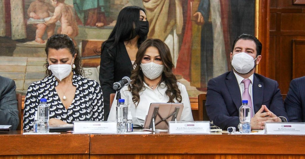 Por la izquierda: Los miembros de la Junta de Coordinación Política de la LXI Legislatura Local, recibieron el Primer Informe de la presidenta de la Comisión de Derechos Humanos del Estado de México (CODHEM), Myrna García Morón, quien recibió un trato relevante por parte de Maurilio Hernández Hernández, el presidente de la misma, quien además es el coordinador del Grupo Parlamentario de MORENA.