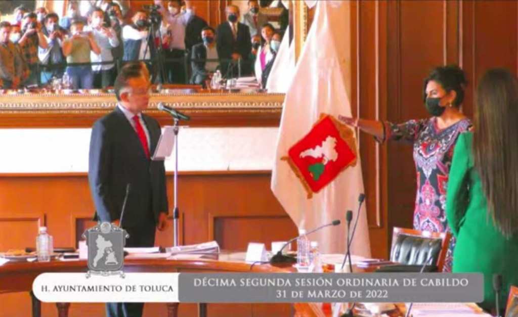 Por el centro: El presidente Municipal de Toluca, Raymundo Martínez Carbajal, tomó protesta a María Elena Barrera Tapia, como nueva directora del Instituto Municipal de la Mujer, luego de que dicho nombramiento fue aprobado por unanimidad del cuerpo edilicio.