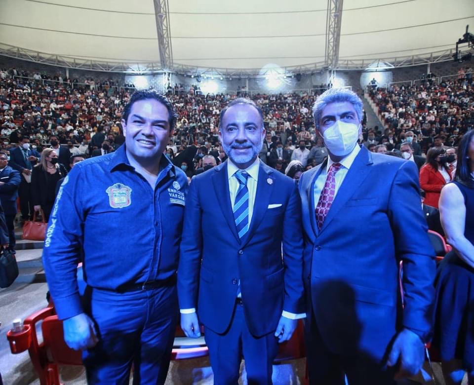 Por la derecha: El presidente Municipal de Metepec, Fernando Flores Fernández, presentó su informe de 100 Días de Gobierno, respaldado por Ernesto Nemer Alvarez, el secretario General de Gobierno y Enrique Vargas del Villar, el coordinador nacional de diputados locales del Partido Acción Nacional (PAN).