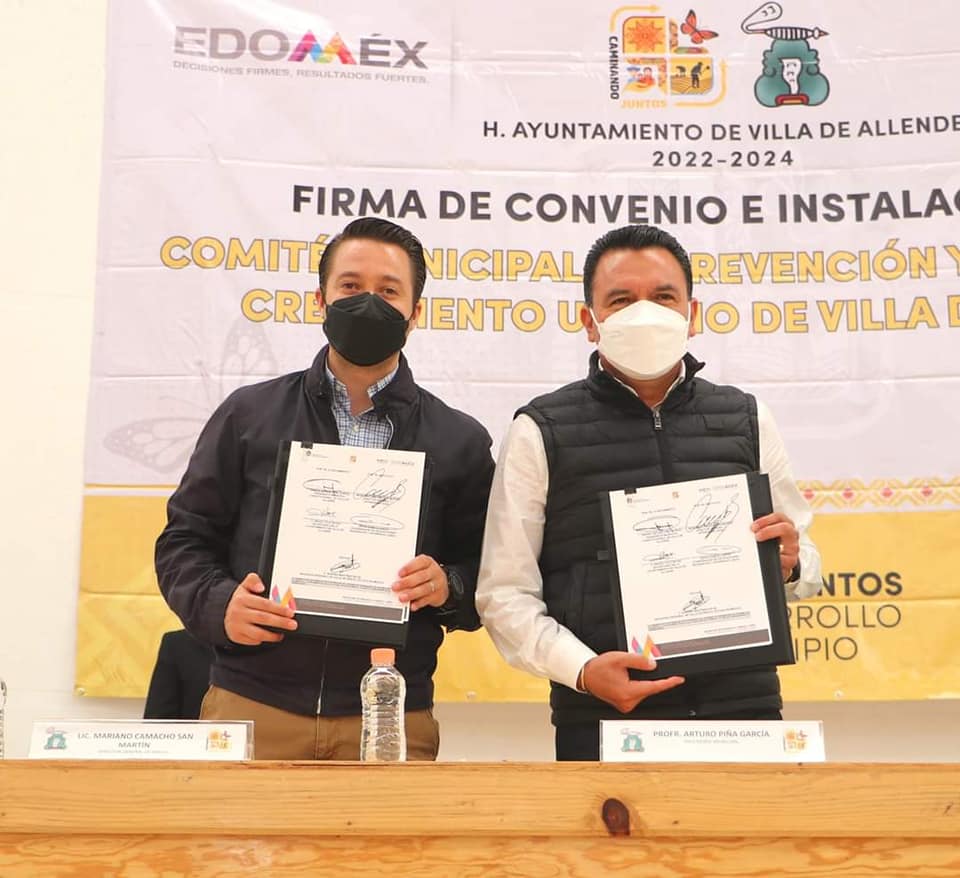 Por la izquierda: El presidente Municipal de Villa de Allende, Arturo Piña García, recibió a Mariano Camacho San Martín, el director del Instituto Mexiquense de la Vivienda Social (IMEVIS), con quien se firmó el Convenio e Instalación del Comité Municipal de Prevención y Control del Crecimiento Urbano.