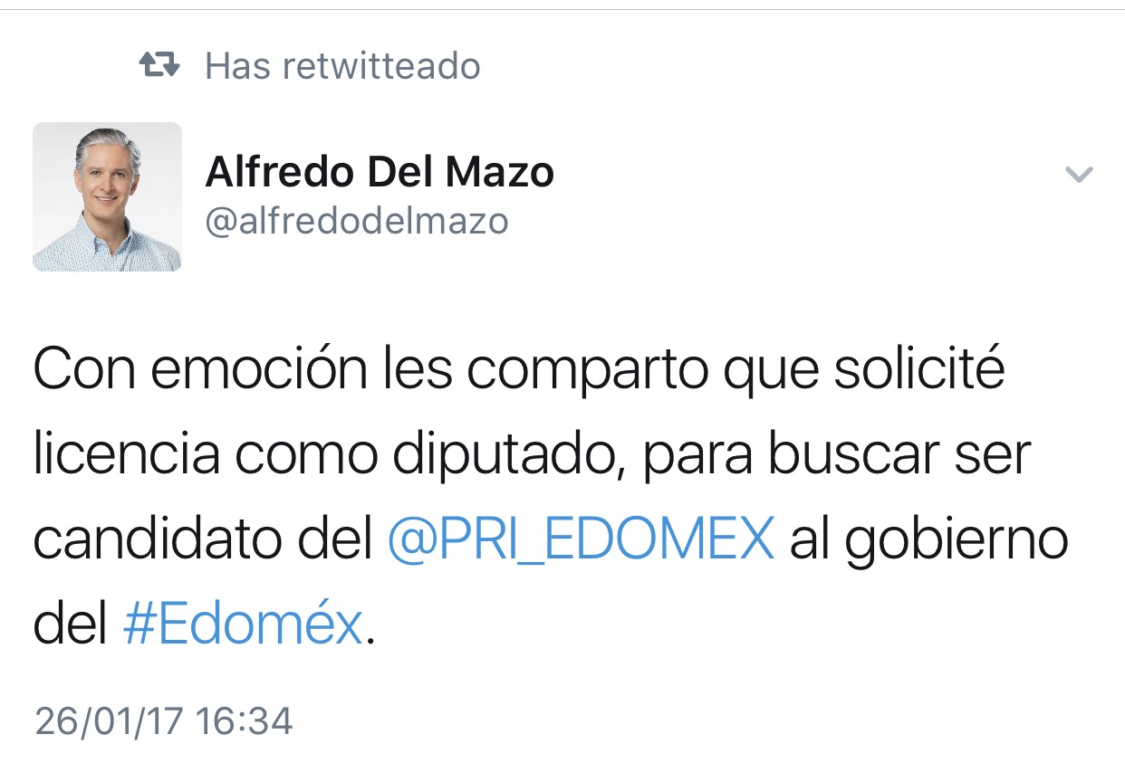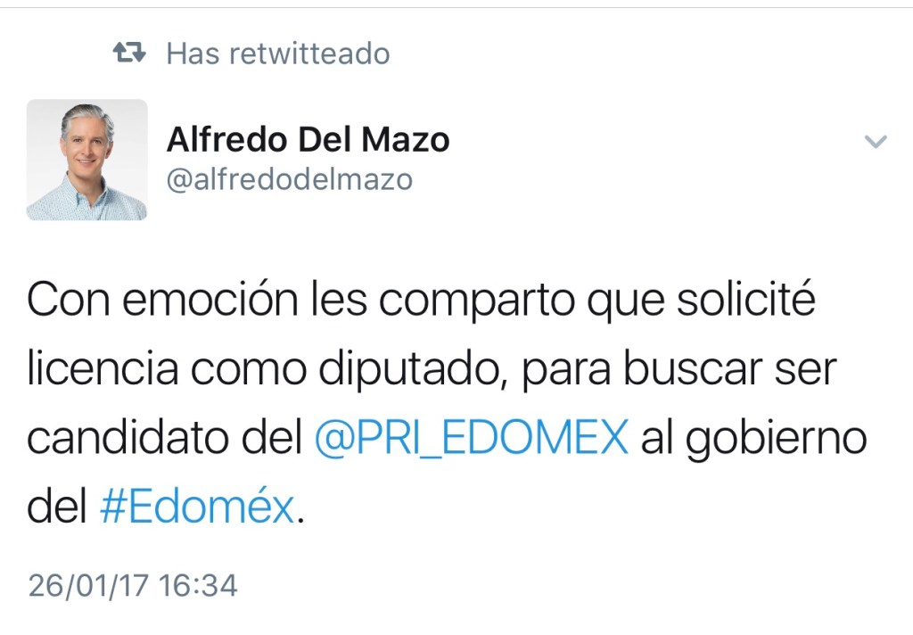A las 16:29 horas de ese 26 de Enero, anuncie en mis redes sociales que Alfredo del Mazo había presentado solicitud de licencia al cargo para ser el candidato de unidad a gobernador, lo que dio a conocer dicho personaje a las 16: 34 horas.