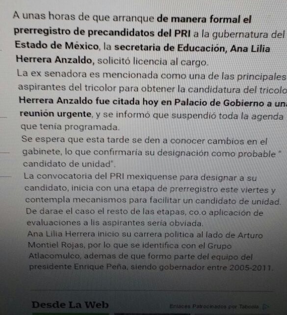 Aun cuando ya se había tomado la decisión sobre la candidatura, el 26 de Enero del 2017, algunos medios nacionales y estatales dieron a conocer alrededor de las 14:30 horas, que Ana Lilia Herrera Anzaldo había renunciado a la Secretaría de Educación, para registrarse a la candidatura del PRI.