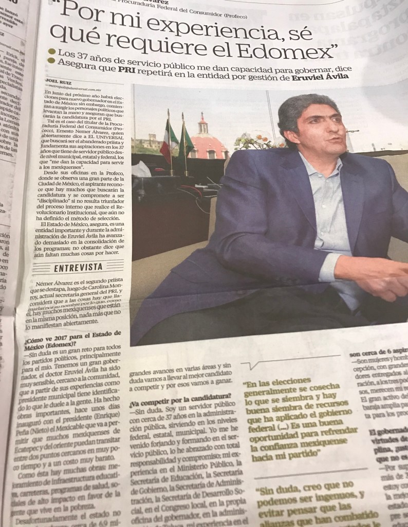 En meses previos a la definición de la candidatura del 2017, Ernesto Nemer, entonces titular de PROFECO, destapó sus aspiraciones en el periódico “El Universal”, hoy adopta la postura de no insertarse en la lista de auto destapados, y por el contrario dice estar concentrado en su responsabilidad como secretario General de Gobierno.