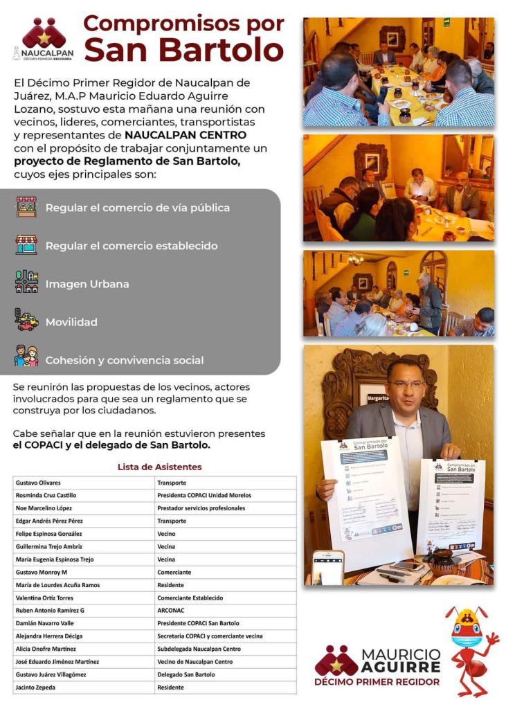 Por la izquierda: El regidor del PT en Naucalpan, Mauricio Aguirre Lozano, signó un importante acuerdo con vecinos, líderes sociales, del comercio, transportistas y representantes de Naucalpan centro, con la finalidad de trabajar conjuntamente en la elaboración de un Proyecto de Reglamento de San Bartolo, con ejes importantes que además son necesarios para todos.