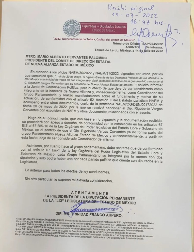Mediante un documento firmado por ella y con copia para los líderes parlamentarios de todos los partidos políticos, en el cual ya no aparece Rigoberto Vargas como jefe del PANAL, se dio a conocer que desde ese momento ya no forma parte del Grupo Parlamentario Nueva Alianza Estado de México y consecuentemente a partir de esta fecha, deja de ser considerado coordinador del mismo.