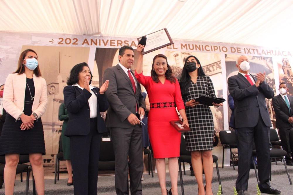 Por el centro: Este fin de semana Leticia Mejía García, secretaria del Campo mexiquense, recibió la Presea de Honor al Mérito Ixtlahuaquense, en la Categoría a la Administración Pública, en el marco del 202 Aniversario de la Erección Municipal de su natal Ixtlahuaca.