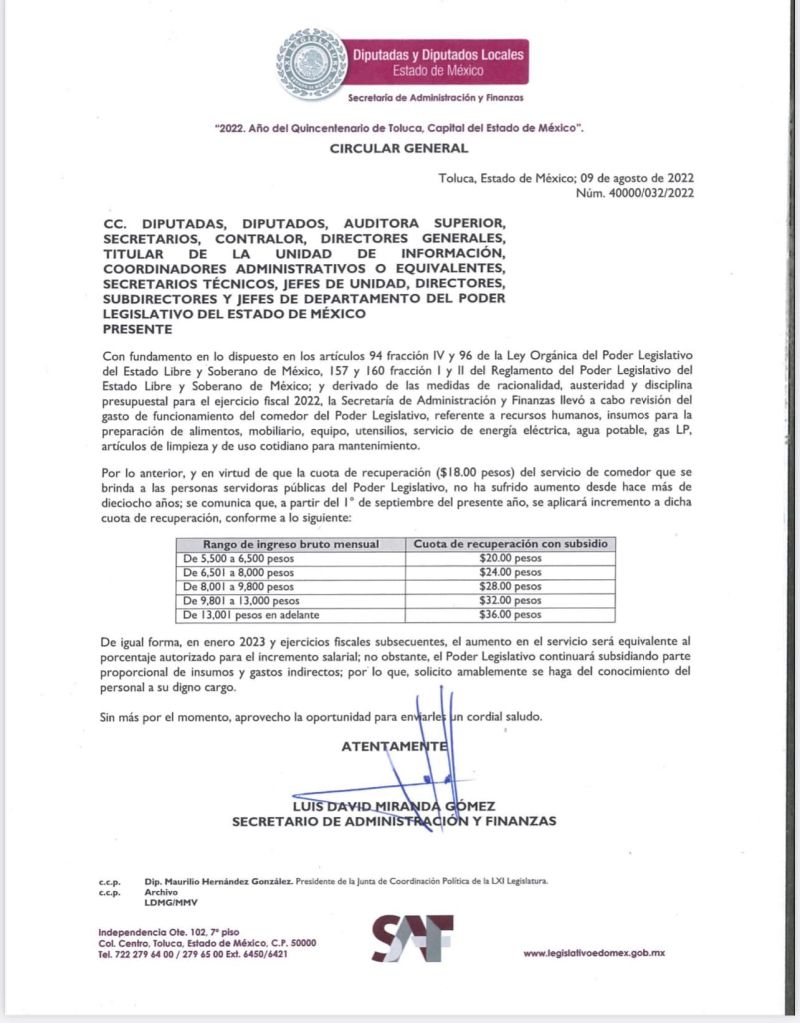 - Incremento a cuota de alimentos en comedor de Legismex