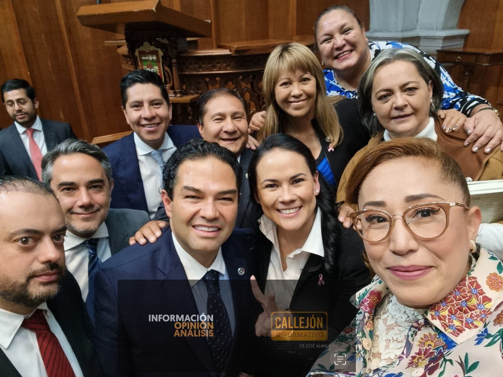 Pero vamos por partes. Alejandra del Moral llegó caminando, de Palacio de Gobierno, al Poder Legislativo, acompañada por un grupo de mujeres colaboradoras, por ejemplo Tanya Rellstab; Aidé Flores Delgado, Diana Pérez Barragán, entre otras.