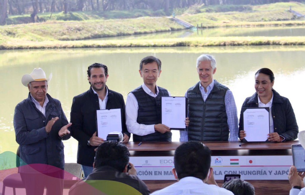 Por el centro: El gobernador Alfredo del Mazo Maza presentó el acuerdo de colaboración científico-académica entre el Gobierno del Estado de México y la Agencia de Cooperación Internacional de Japón, con la finalidad de capacitar a productores mexiquenses en técnicas modernas de acuicultura, implementar programas conjuntos de investigación e intercambio de tecnologías.