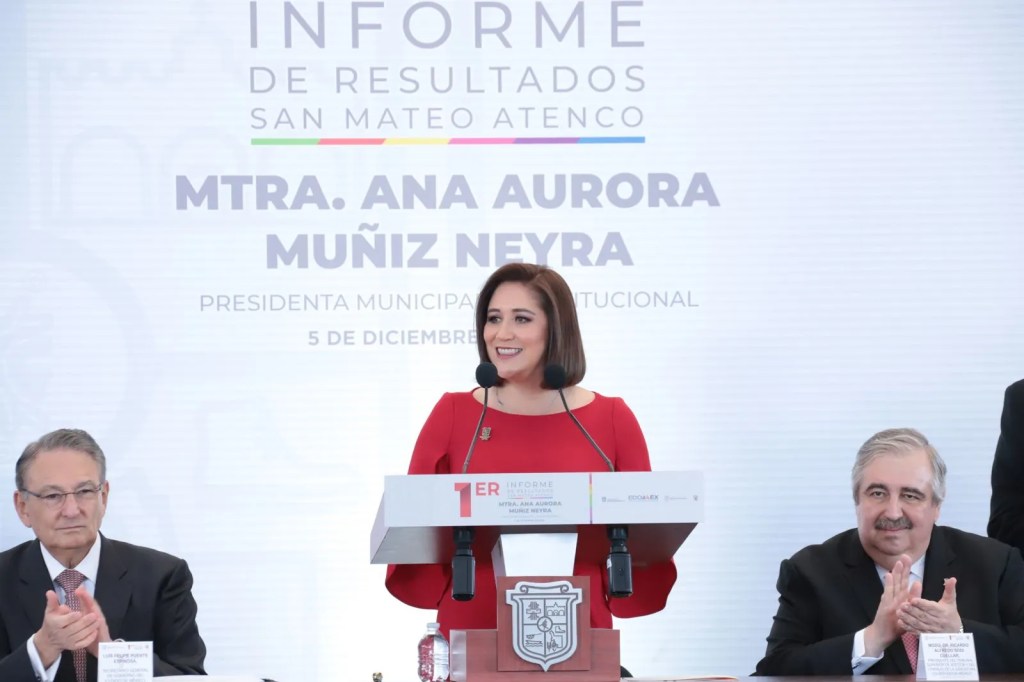 Por el centro: La presidenta Municipal de San Mateo Atenco, Ana Muñiz Neyra, rindió su Primer Informe de Gobierno, con la presencia de Luis Felipe Puente Espinoza, el secretario general de Gobierno, quien acudió como representante del Ejecutivo, además estuvieron presentes el presidente del Poder Judicial, Ricardo Sodi Cuéllar y políticos de la región como la ex dirigente nacional del PRI, Carolina Monroy del Mazo; los legisladores Laura Barrera Fortoul; Alfredo Quiroz y Miguel Torres Cabello, el director General del DIFEM, así como alcaldes vecinos.