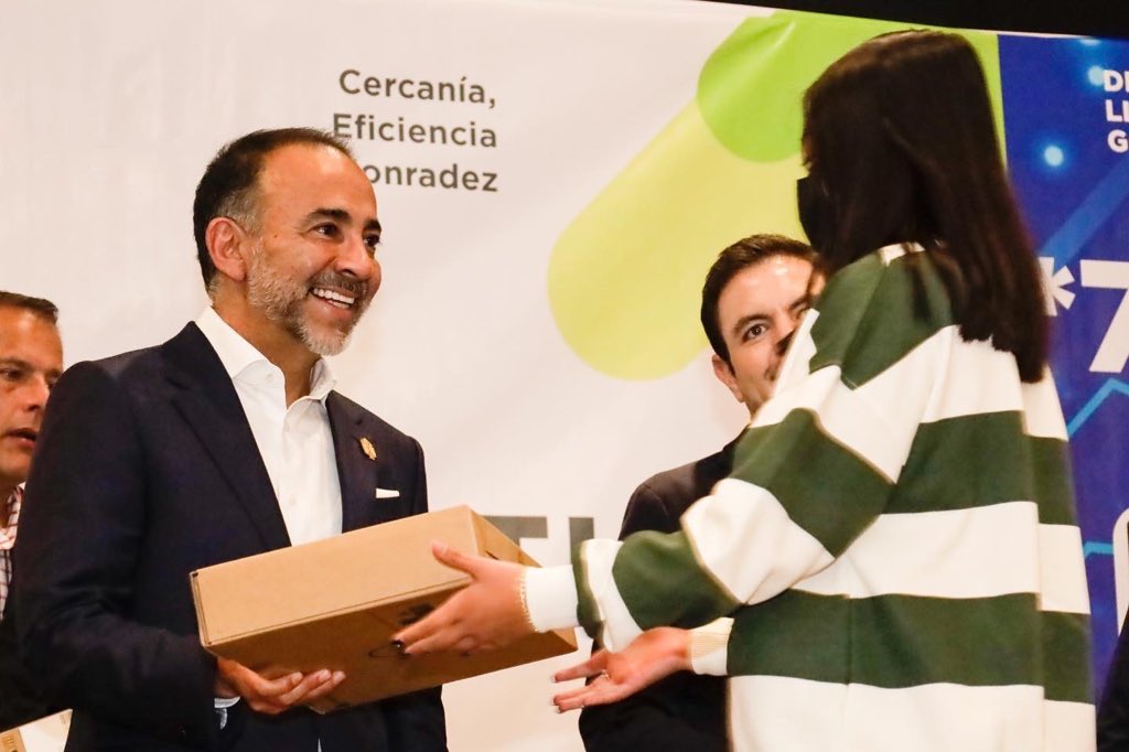 Por la derecha: El presidente Municipal de Metepec, Fernando Flores Fernández, entregó 100 computadoras a niños y niñas metepequenses que mostraron alto nivel de aprovechamiento escolar en cuanto a calificaciones.