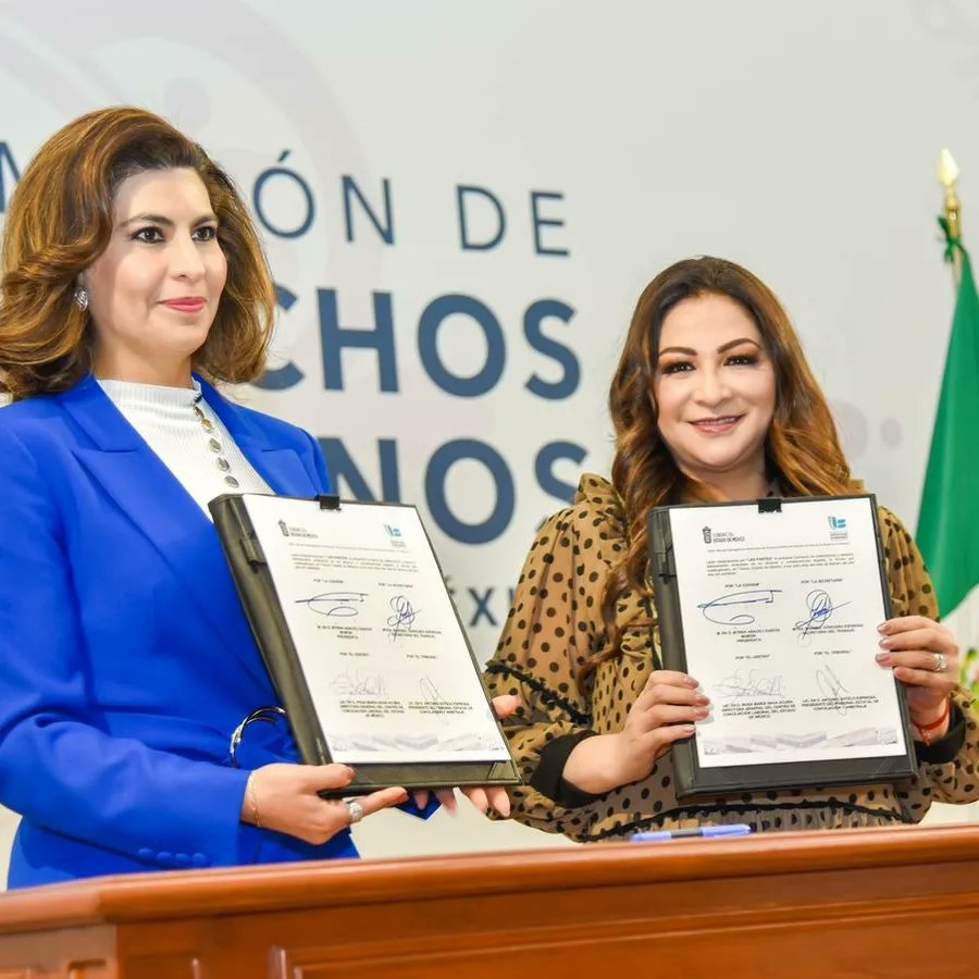 Por el centro: La presidenta de la Comisión de Derechos Humanos (CODHEM), Myrna García Morón y la secretaria del Trabajo, Maribel Góngora, firmaron un importante convenio de colaboración que permitirá promover los derechos humanos laborales en la entidad.