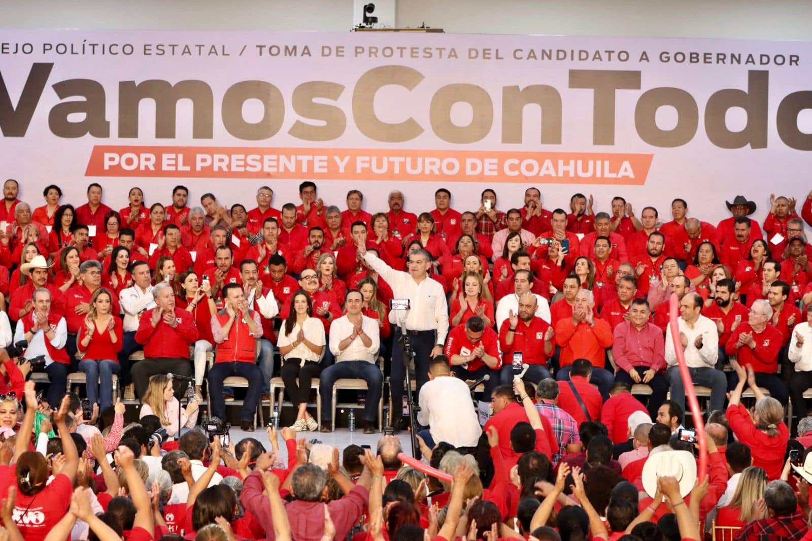 El priismo de Coahuila dio un contundente mensaje de fortaleza rumbo a la elección de gobernador, durante la toma de protesta de Manolo Jiménez Salinas, como candidato del PRI, en sesión del Consejo Político Estatal, en el que estuvo presente el mandatario en turno, Miguel Riquelme Solís, además acudió como invitado especial el titular del Ejecutivo de Durango, Esteban Villegas Villarreal.