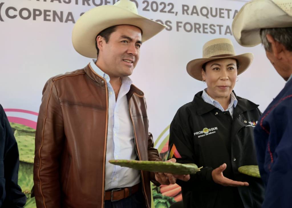 Por el centro: Luego de la realización de la feria que resultó un éxito comercial para las familias del municipio, el presidente Municipal de Almoloya de Juárez, Oscar Sánchez García, recibió a la secretaria del Campo, Leticia Mejía, con quien entregó Seguros Catastróficos.