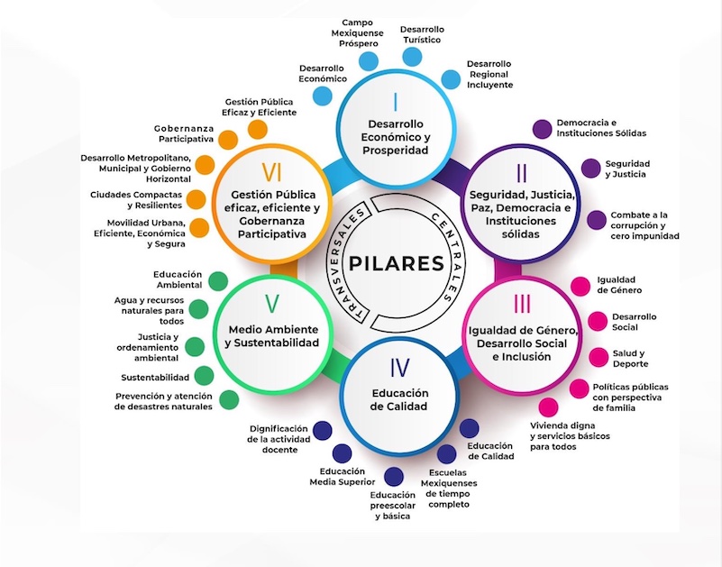 Los seis Pilares son: “Desarrollo Económico y Prosperidad”; “Seguridad, Justicia, Paz, Democracia e Instituciones Sólidas”; “Igualdad de Género, Desarrollo Social e Inclusión”; “Educación de Calidad”; “Medio Ambiente y Sustentabilidad” y “Gestión Pública Eficaz, Eficiente y Gobernanza Participativa”.