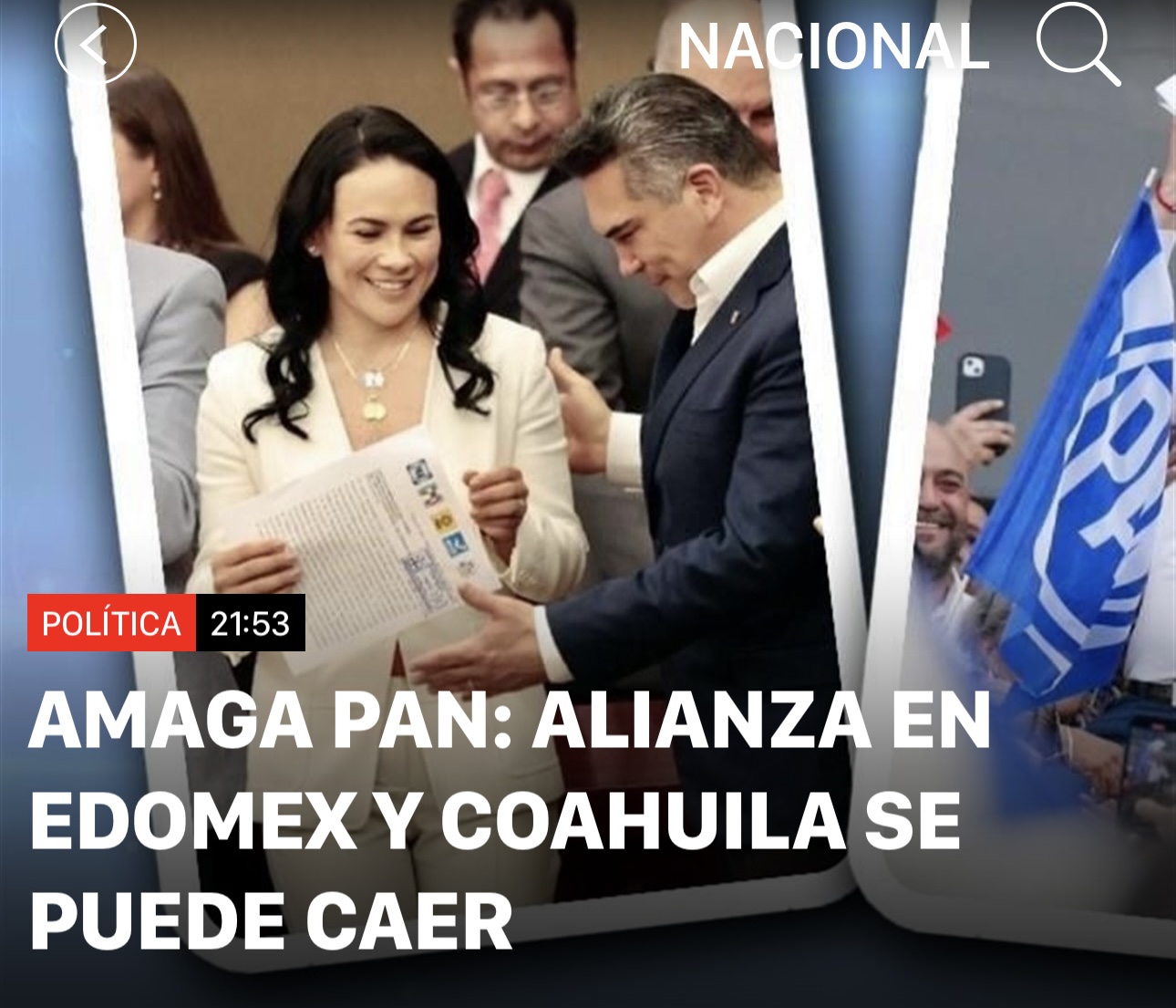 Por la derecha: De acuerdo con la nota principal de la sección Nacional, del periódico Reforma, el líder nacional del PAN, Marko Cortés Mendoza, advirtió que se podría caer la coalición en Edomex y Coahuila, si la bancada federal del PRI vota diferente en el tema que tiene que ver con los nuevos consejeros electorales del INE. El asunto ha generado tensión en San Lázaro.