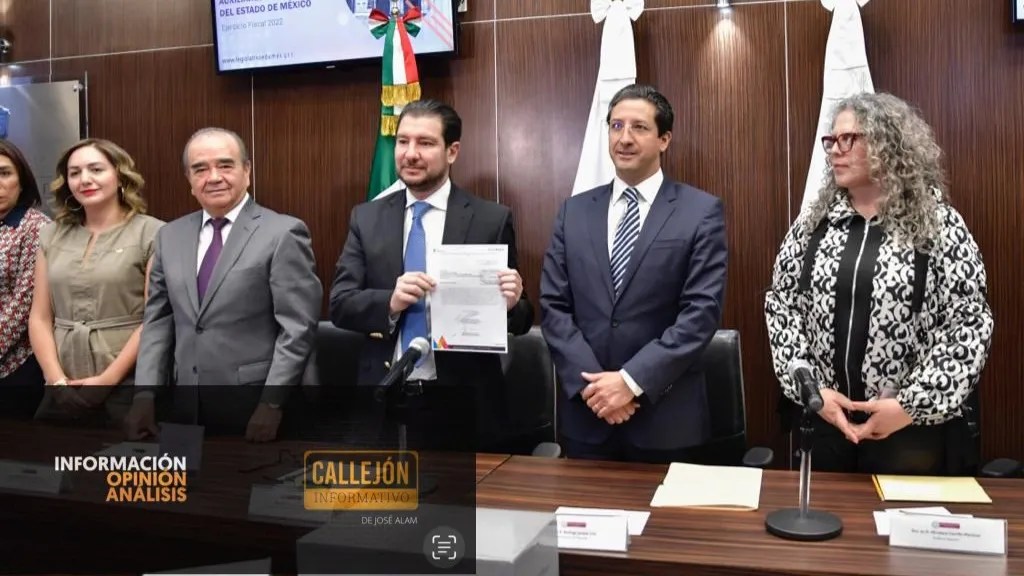 Por el centro2: La Junta de Coordinación Política de la LXI Legislatura Local, encabezada por Elías Rescala Jiménez, y miembros de la Comisión de Vigilancia del Órgano Superior de Fiscalización recibieron la Cuenta Pública del gobierno, organismos auxiliares y autónomos del Estado de México del ejercicio fiscal 2022.