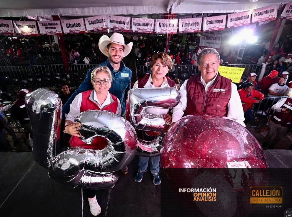 Por la izquierda: Por la noche, Delfina Gómez Álvarez, candidata de morena-PT-PVE,, dio a conocer que logró su meta de visitar los 125 municipios mexiquenses rumbo a la elección de este domingo 4 de junio.