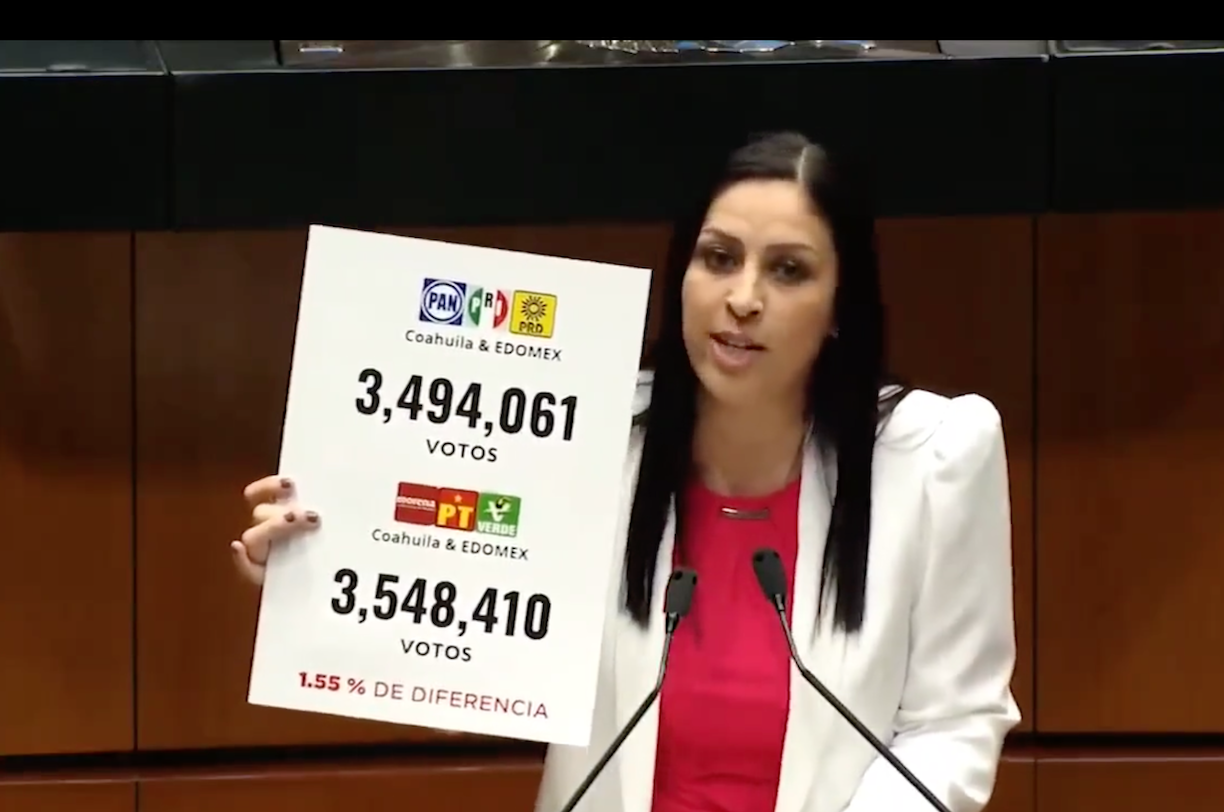 Por el centro: En la sesión de la Comisión Permanente de la LXV Legislatura Federal, en el Senado de la República, la diputada mexiquense del PRI, Sue Bernal Bolnik, generó el debate en el pleno y discusión entre las bancadas. Mostró una cartulina donde exhibió que sumando los votos de los bloques en Coahuila y Edomex, la diferencia es apenas de 1.5 puntos.