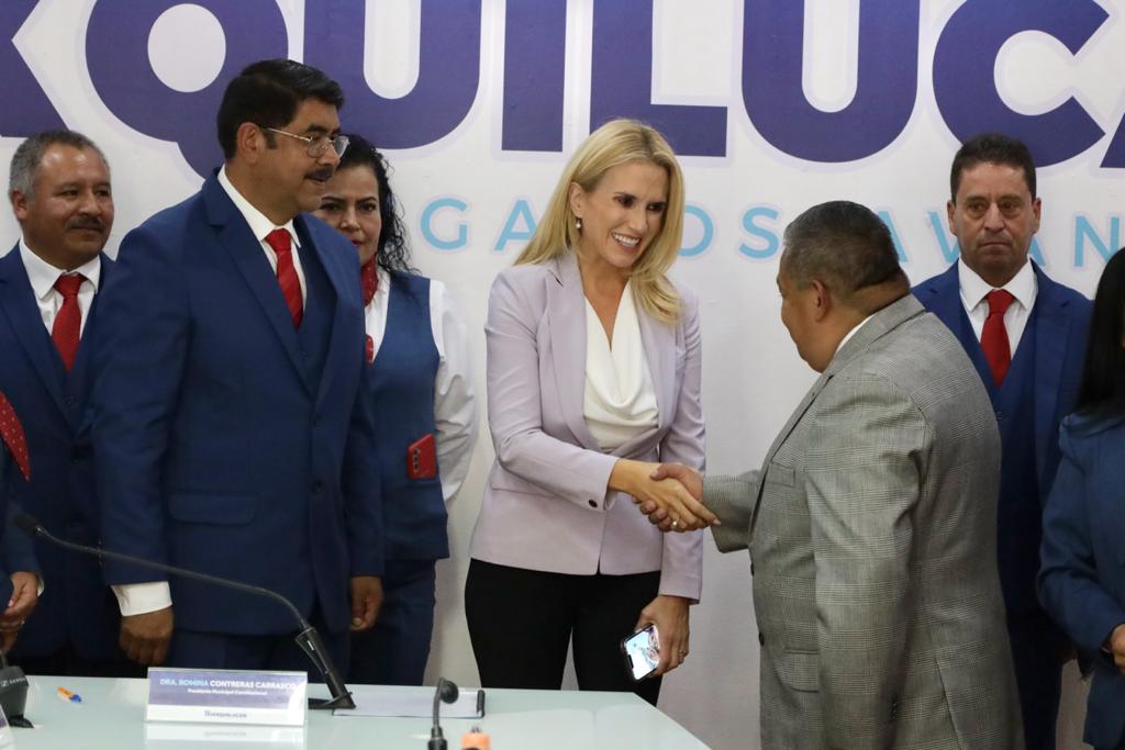 Por la derecha: La presidenta Municipal de Huixquilucan, Romina Contreras, dio a conocer que el cabildo aprobó un aumento del cinco por ciento directo al salario base y a las cláusulas colaterales extraordinarias del convenio general, con los trabajadores sindicalizado.