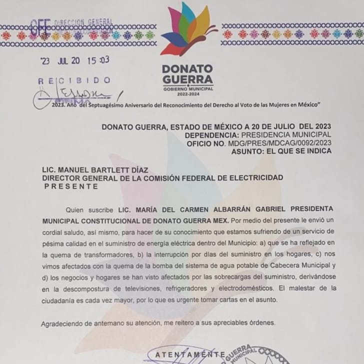 - Pide Donato Guerra apoyo a CFE por problemas de servicio de energía eléctrica