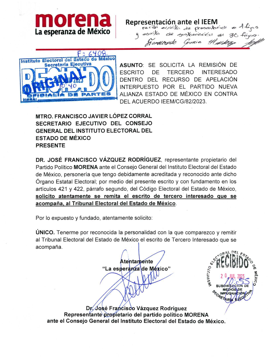 A través de Francisco Vázquez Rodríguez, representante de morena ante el IEEM, dicho partido establece que los medios promovidos por Nueva Alianza y sus aliados electorales, resultan infundados, por lo cual el Tribunal Electoral debe reconocer válido el acuerdo IEEM/CG/82/2023 que se refiere a la designación de la persona interventora responsable del control y vigilancia directos del uso y destino de los recursos y bienes de Nueva Alianza.