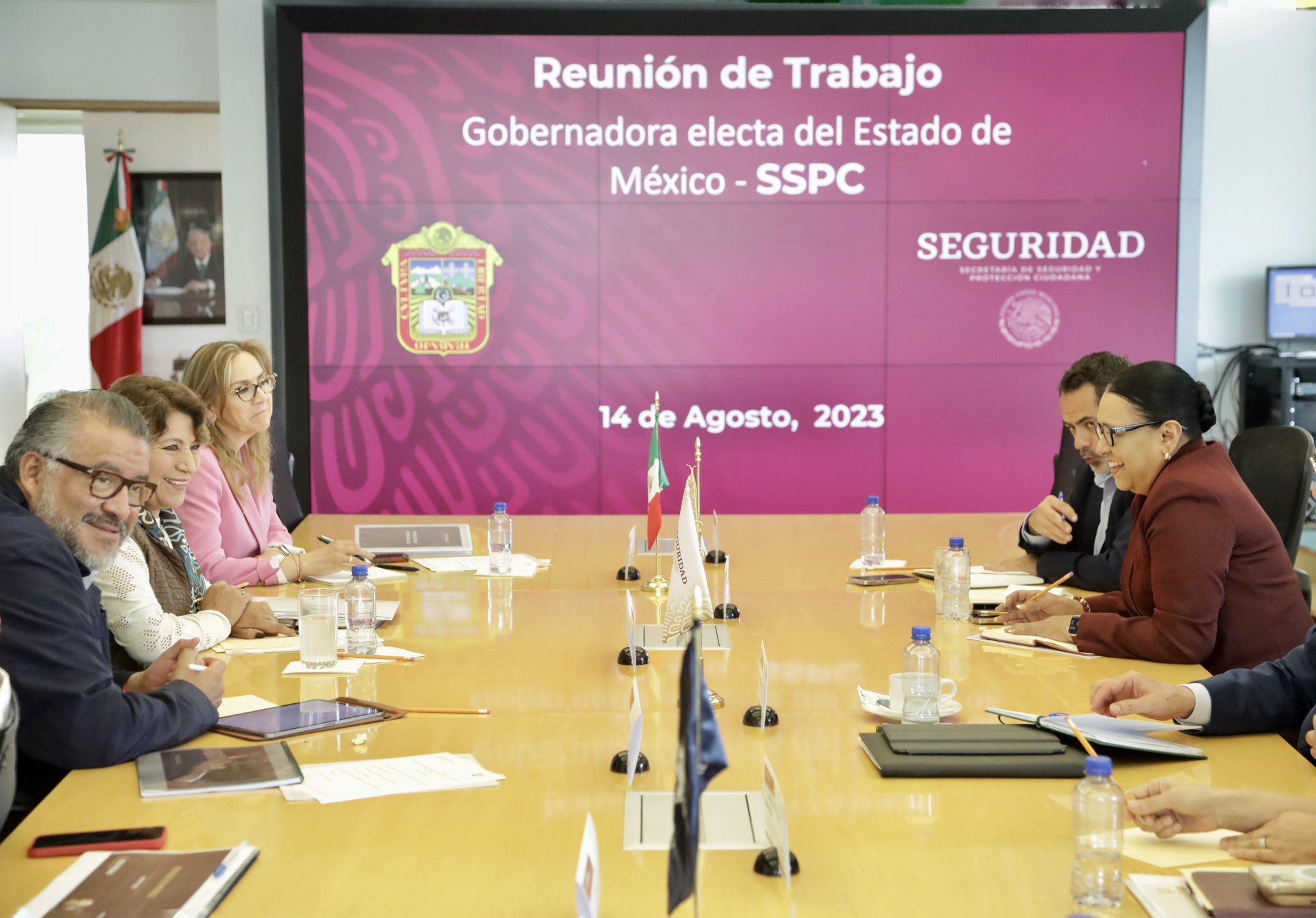 Por la izquierda: Previo a la quinta reunión del Programa de Transición en el Gobierno del estado de México; Delfina Gómez Álvarez, gobernadora electa, se reunió con Rosa Icela Rodríguez Velázquez, secretaria de Seguridad y Protección Ciudadana (SSPC) del Gobierno Federal, mientras que en días anteriores estuvo con Luis Crescencio Sandoval, secretario de la Defensa Nacional.