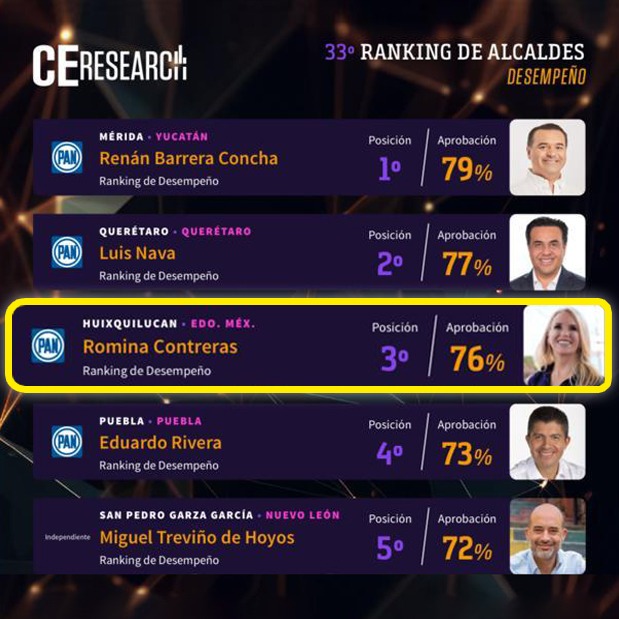 De acuerdo con la medición mensual de esta empresa, Romina Contreras obtuvo un nivel de aprobación ciudadana de 76 por ciento, el tercero más alto del país y el primero para una alcaldesa mujer y para una presidenta municipal del Estado de México, contemplando ambos géneros.