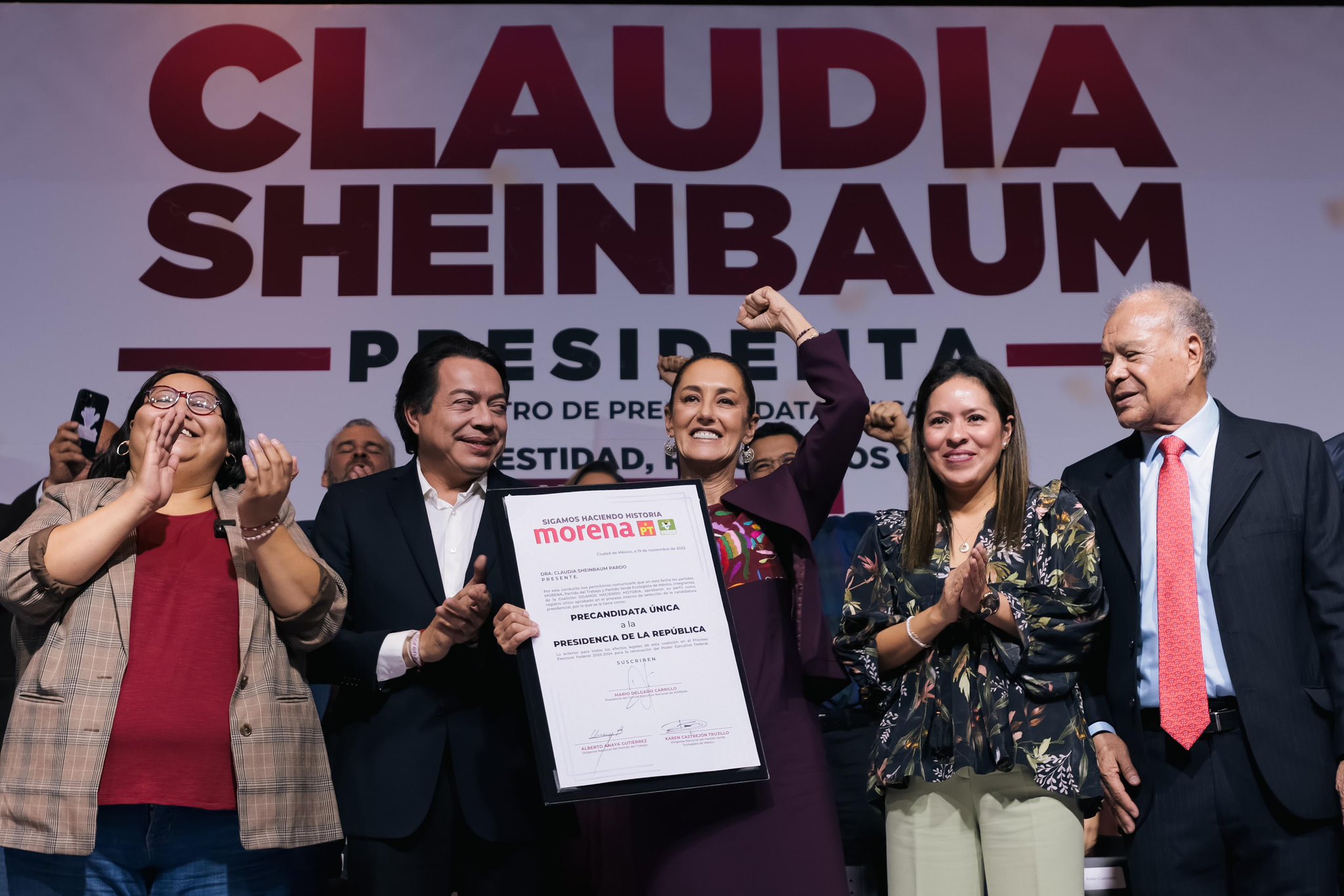 Sheinbaum recibió la constancia como precandidata única de morena-PT-PVEM a la Presidencia de la República, acto en el cual aseguró que “la autoridad moral y la honestidad no se compran en la esquina, se construyen con una sola mística y con la de luchar siempre por el bienestar, la justicia y libertad”.