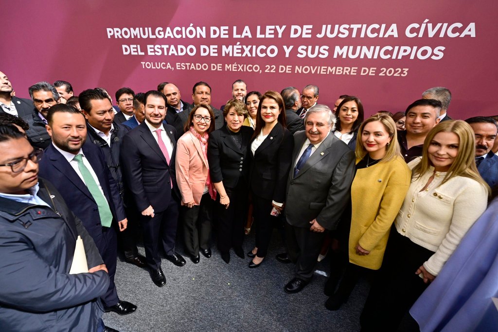 La gobernadora Delfina Gómez Álvarez convocó a los representantes de los Poderes Legislativo, Judicial, así como a presidentes Municipales y legisladores, al acto simbólico de promulgación de la ley de Justicia Cívica del estado de México y Municipios, en la que mucho tuvo que ver el Grupo Parlamentario del PRI, primero con la iniciativa de Karla Aguilar Talavera y, luego, la construcción de acuerdos por parte de Elías Rescala Jiménez.