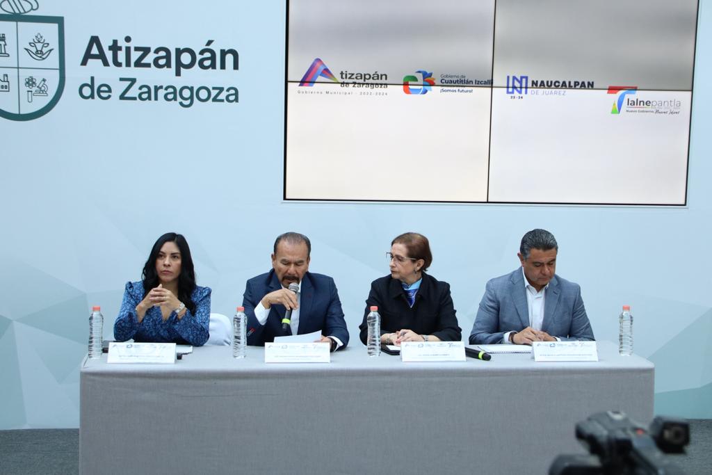 Por la derecha: Tras los problemas que se han encontrado con el abastecimiento de agua en el Valle de México, la presidenta municipal de Cuautitlán Izcalli, Karla Fiesco García, asistió a la rueda de prensa con sus homólogos de Naucalpan de Juárez, Angélica Moya Marín, Pedro Rodríguez Villegas, de Atizapán de Zaragoza y Marco Antonio Rodríguez Hurtado, de Tlalnepantla de Baz, quienes hicieron un llamado a las autoridades estatales y federales para trabajar de manera conjunta ante la problemática derivada del recorte del Sistema Cutzamala.