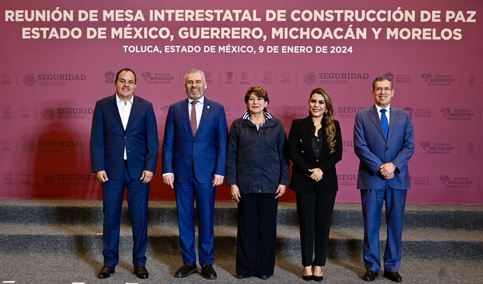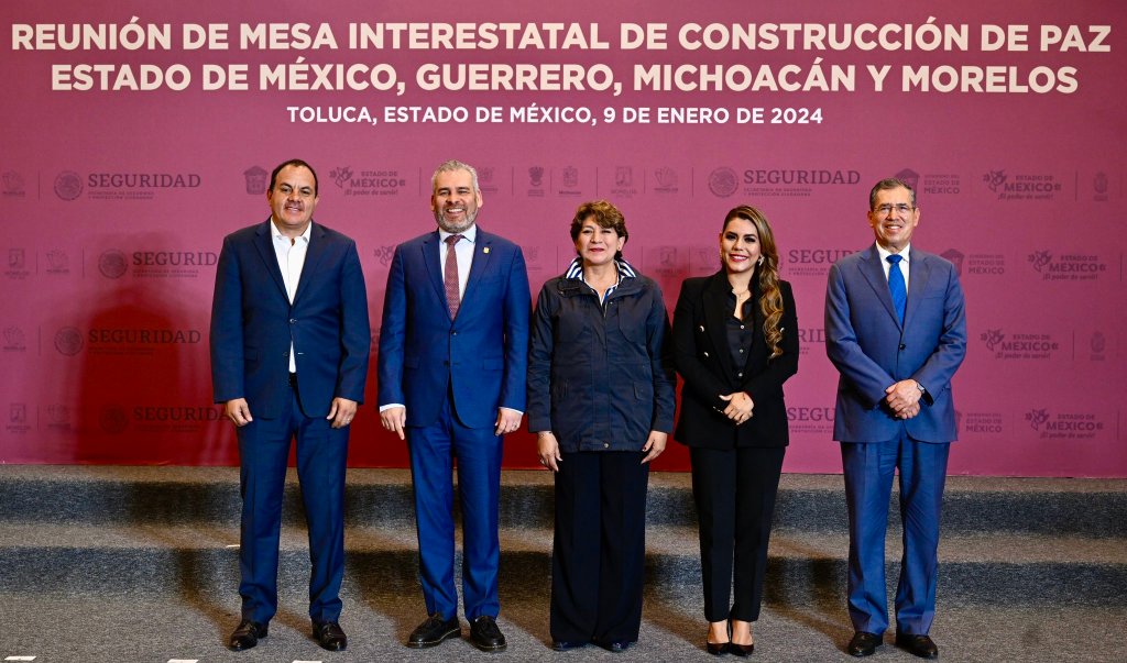 Por la izquierda: La gobernadora mexiquense, Delfina Gómez Álvarez recibió a sus homólogos de Guerrero, Morelos y Michoacán, Evelyn Salgado Pineda, Cuauhtémoc Blanco y Alfredo Ramírez Bedolla, respectivamente, quienes realizaron en la capital del Edomex la Primera Mesa Interestatal de Construcción de Paz, en la que se acordó de manera urgente, establecer el nuevo Centro Coordinador de Operaciones Interestatales para la Región de Tierra Caliente.