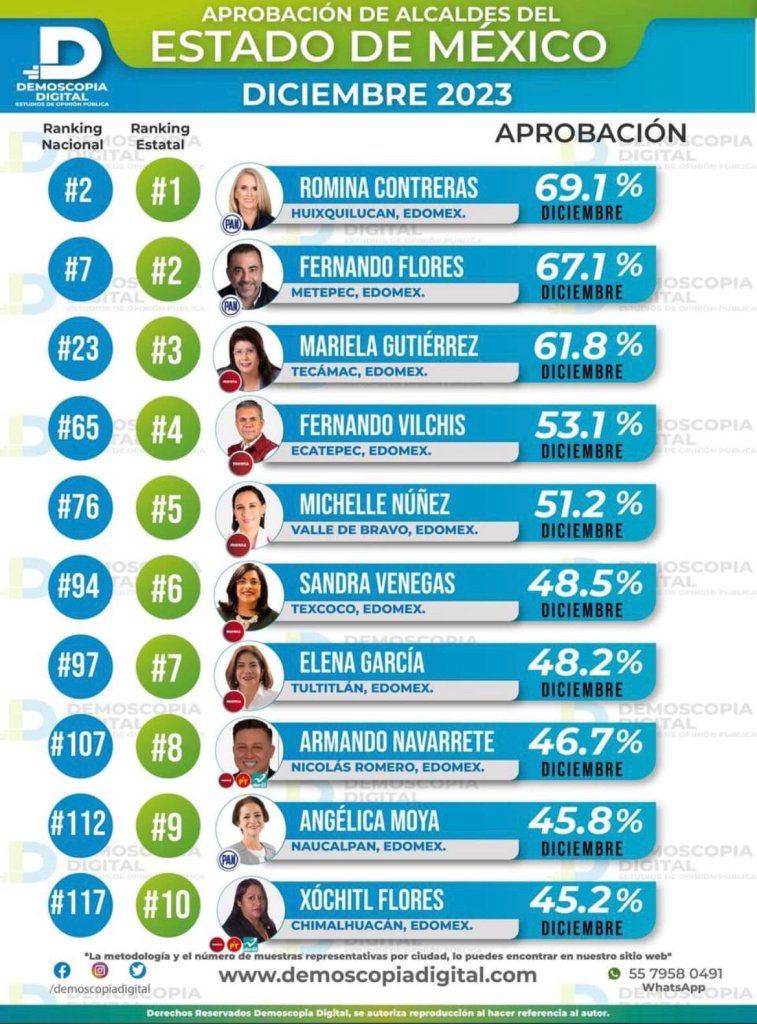 Por la derecha: El presidente Municipal de Metepec, Fernando Flores Fernández, resaltó que de acuerdo con la empresa Demoscopia Digital, es el segundo mejor evaluado, muy cerca de Romina Contreras Vargas, de Huixquilucan.