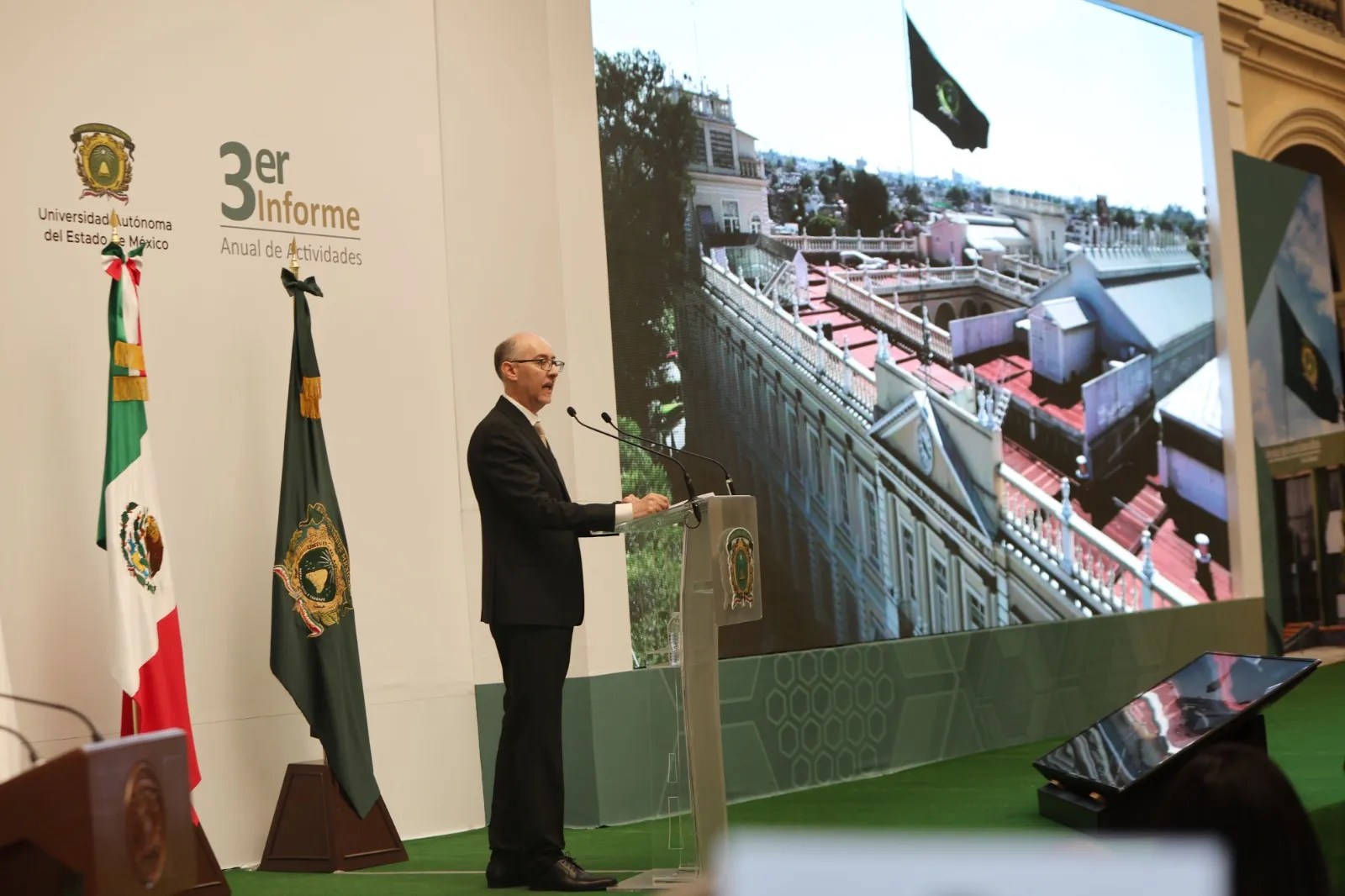 El domingo, Carlos Barrera rindió su Tercer Informe en el cual aseveró que la UAEM es una institución en constante desarrollo y crecimiento, dinámica que se ve impulsada por una comunidad de mujeres y hombres con un permanente espíritu de superación que la consolida como ejemplo para la entidad mexiquense.