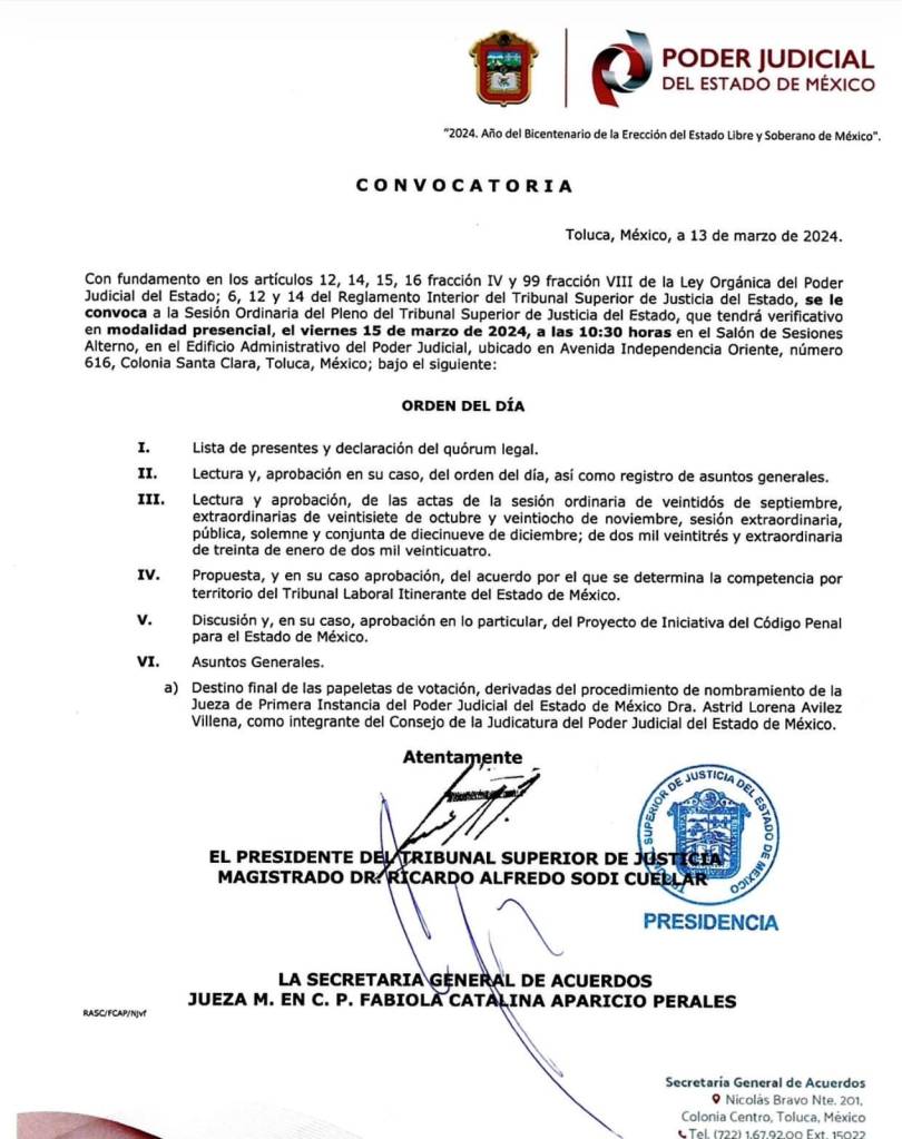 La Secretaría General de Acuerdos del Poder Judicial convocó el 13 de marzo a la sesión ordinaria, presencial, del pleno del Tribunal, en el Salón de Sesiones Alterno, que se ubica en el Edificio Administrativo, de Toluca.