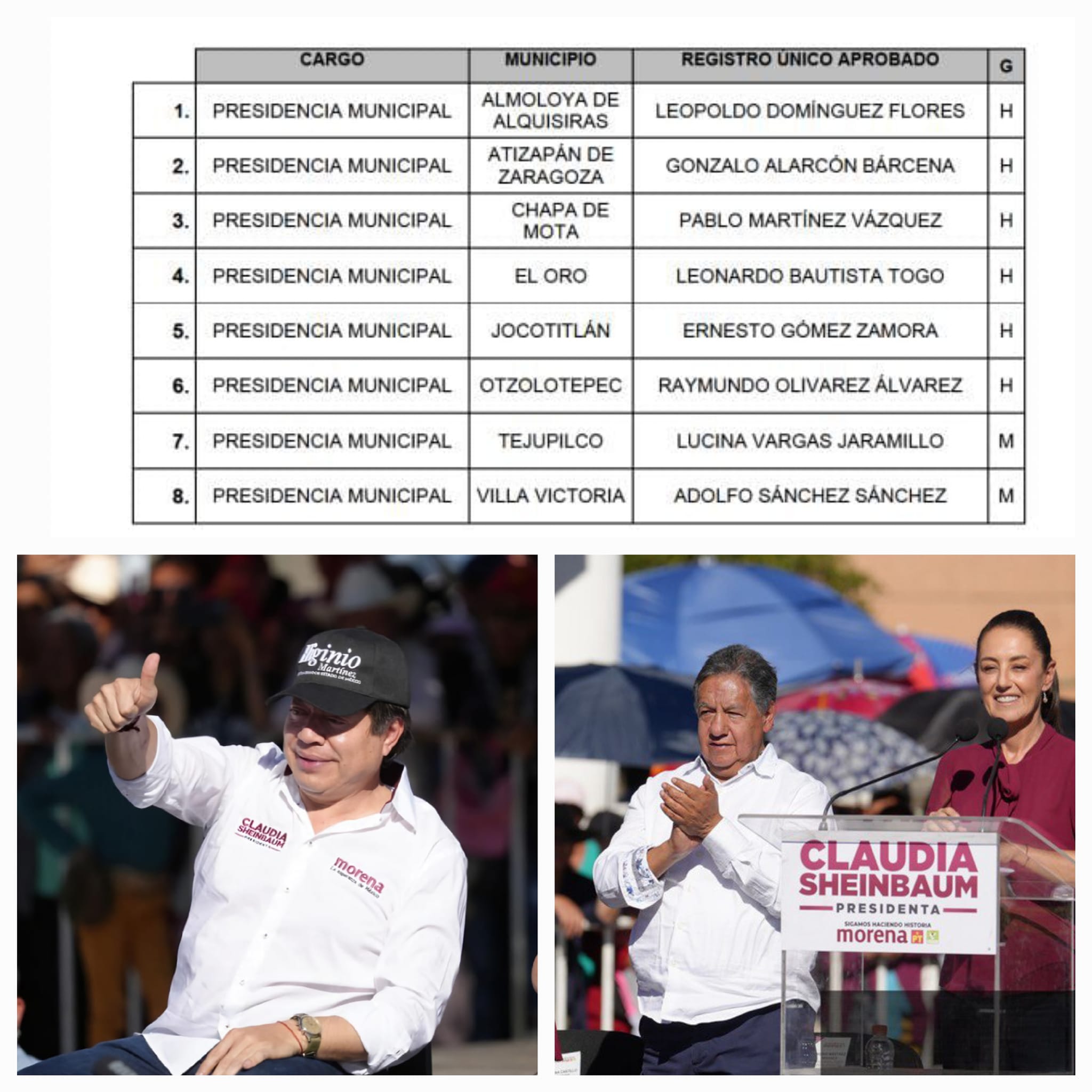 Los registros aprobados corresponden a Leopoldo Domínguez Flores, para la Presidencia Municipal de Almoloya de Alquisiras; Gonzálo Alarcón, Atizapán; Pablo Martínez Vázquez, Chapa de Mota; Leonardo Bautista Togo, El Oro; Ernesto Gómez Zamora, Jocotitlán; Raymundo Olivarez Álvarez, Otzolotepec; Lucina Vargas Jaramillo, Tejupilco y Adolfo Sánchez Sánchez, Villa Victoria.