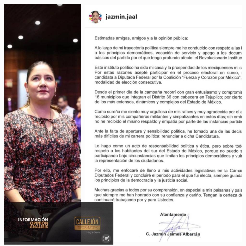 Jazmín Jaimes Albarrán dio a conocer que renunció a la candidatura de la coalición «Fuerza y Corazón por México» a diputada federal por el Distrito Federal, con cabecera en Tejupilco.