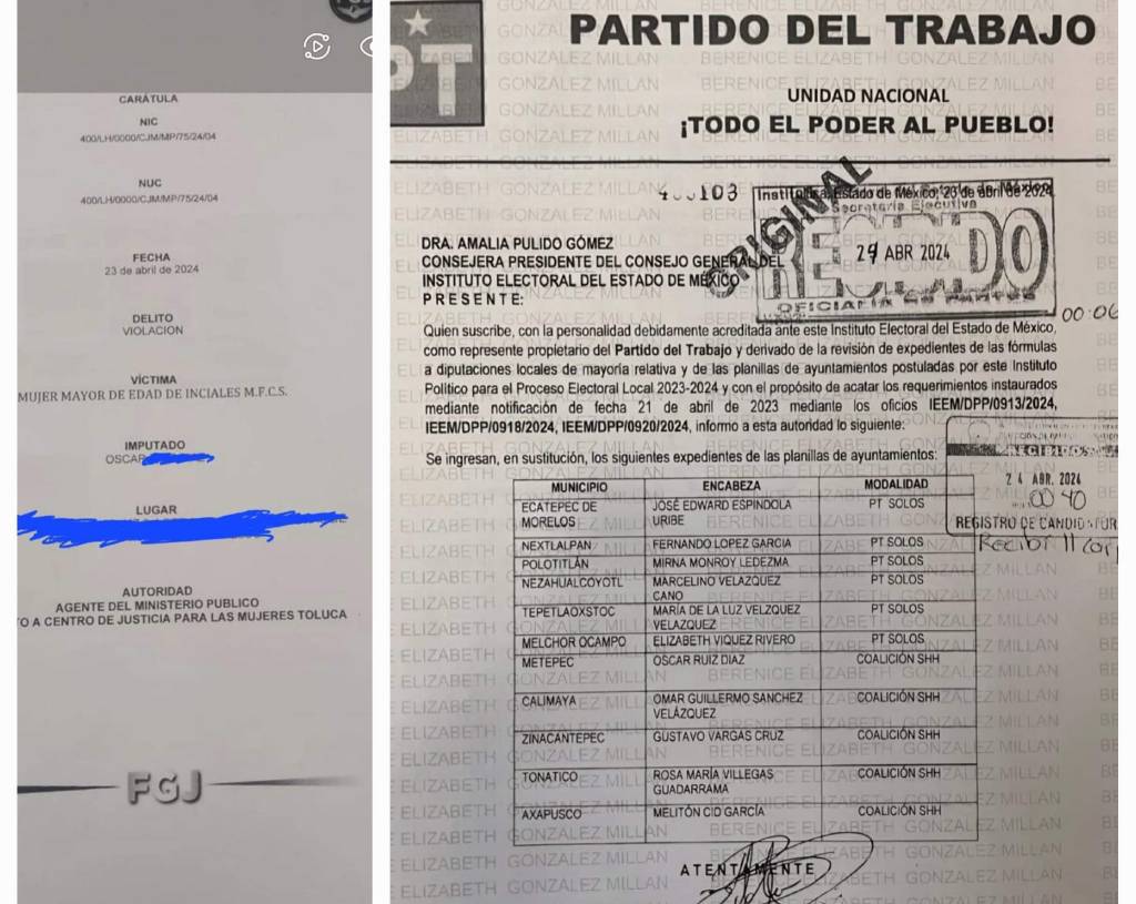 En este contexto, desde Ecatepec, se dio a conocer una denuncia penal por presunta violación en contra de un personaje con el nombre de Oscar Ruiz, y segundo apellido similar al que aparece como candidato registrado por el «Nuevo PT» para la Presidencia Municipal de Metepec.
