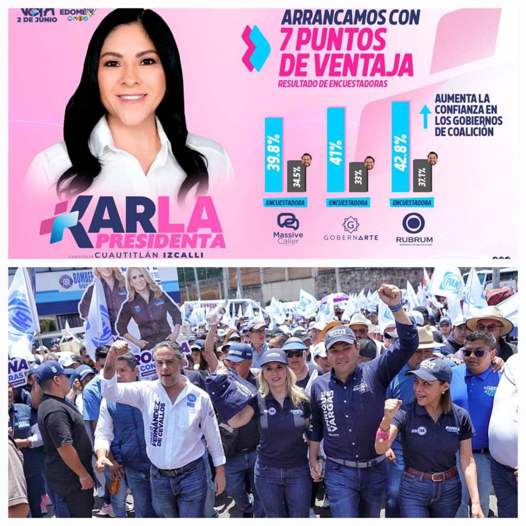 Por la derecha: El panismo busca mantenerse en el llamado corredor azul del Valle de México en estas elecciones; en Huixquilucan no tiene competencia Romina Contreras, mientras que en localidades como Cuautitlán Izcalli, diversas encuestadoras colocan con ventaja a Karla Fiesco García, quien es la candidata de la coalición PRI-PAN-PRD-Nueva Alianza a la Presidencia Municipal.