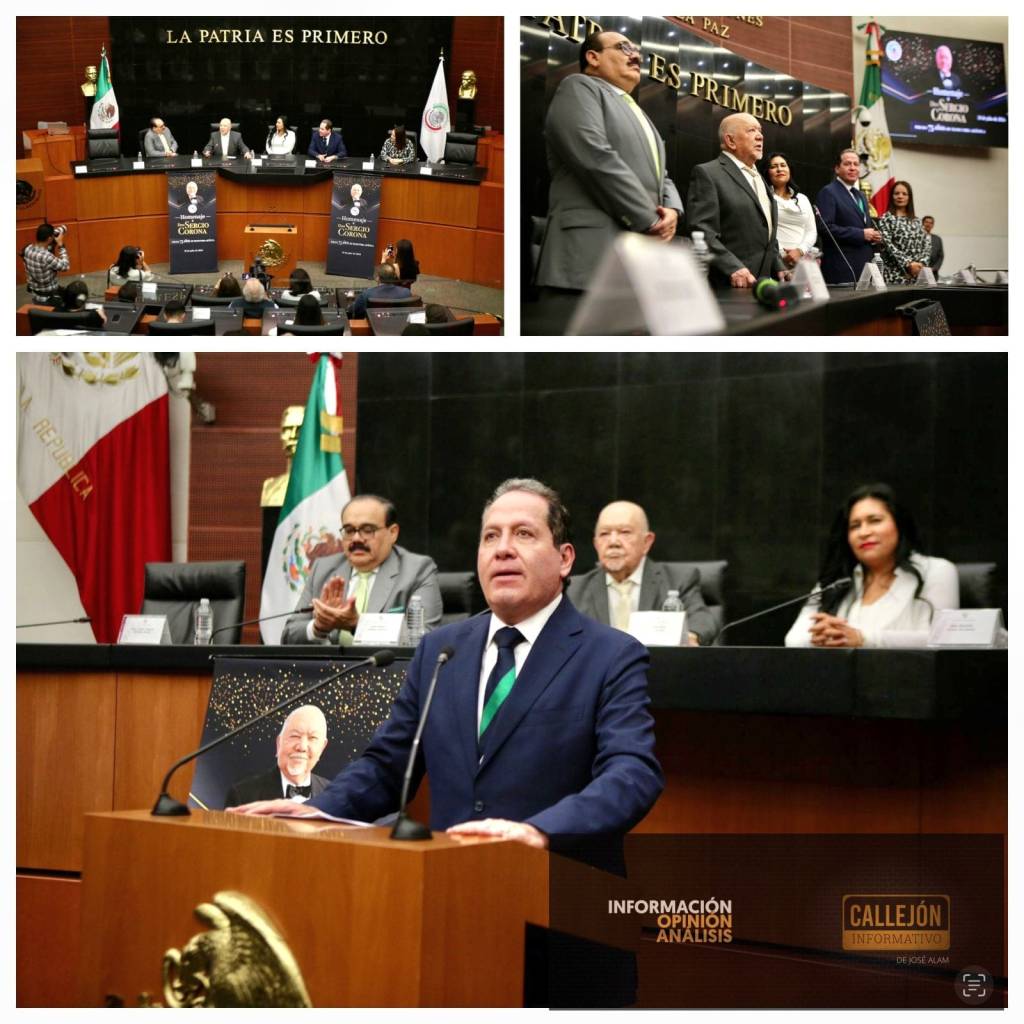 Por la izquierda2: El senador Eruviel Ávila Villegas promovió el reconocimiento en el Senado, al artista Sergio Corona, con una ceremonia sorpresa, en la que estuvo acompañado de familiares, amigos y compañeros de profesión, ante la presidenta de la Directiva, Ana Lilia Rivera Rivera.
