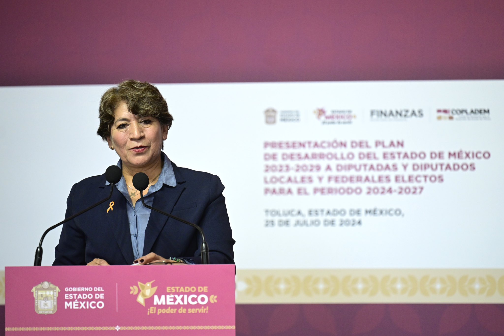 La gobernadora Delfina Gómez presentó el Plan de Desarrollo 2023-2029 ante legisladores estatales y federales electos, advirtiéndoles el documento será la ruta para lograr el bienestar en el Estado de México.