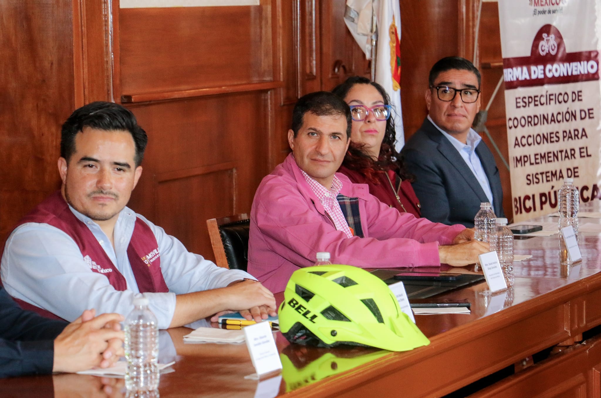 Por la izquierda: El Ayuntamiento de Toluca y la Secretaría de Movilidad del Gobierno Estatal, firmaron un Convenio Marco de Coordinación en materia de Movilidad, Transporte y Seguridad Vial, y una carta de intención para coordinar acciones en favor de la implementación del Sistema de Bicicletas Compartidas “Bici Pública”.
