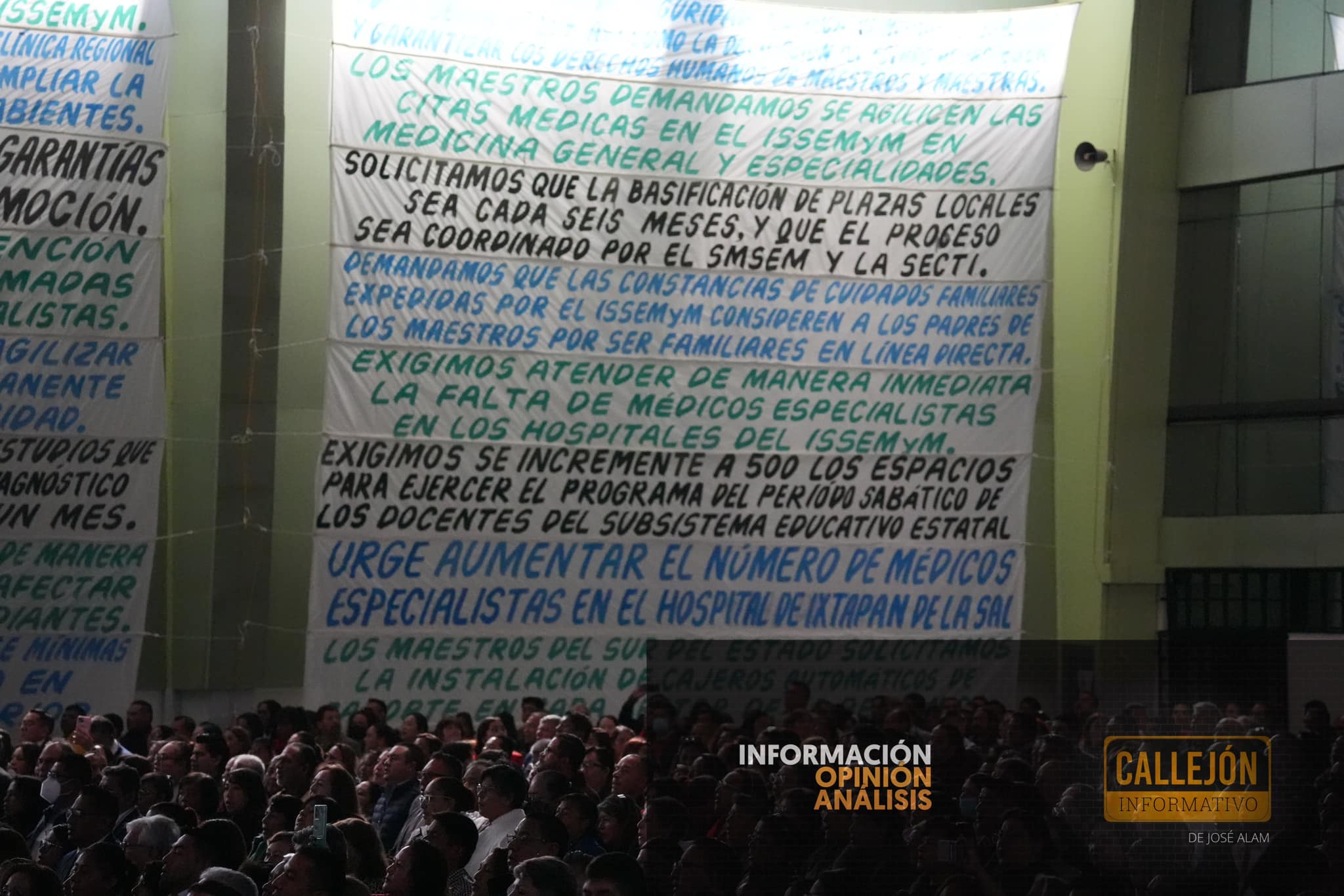 Aunque no estaba confirmado que la gobernadora Delfina Gómez Álvarez acudiría al acto, en el auditorio se observaron mantas gigantes con diversas peticiones, sobre todo en lo que tiene que ver con la solicitud de que la basificación de plazas locales sea cada seis meses, con la coordinación del SMSEM, pero fundamentalmente van en la exigencia de un mejor sistema de atención en el ISSEMyM.