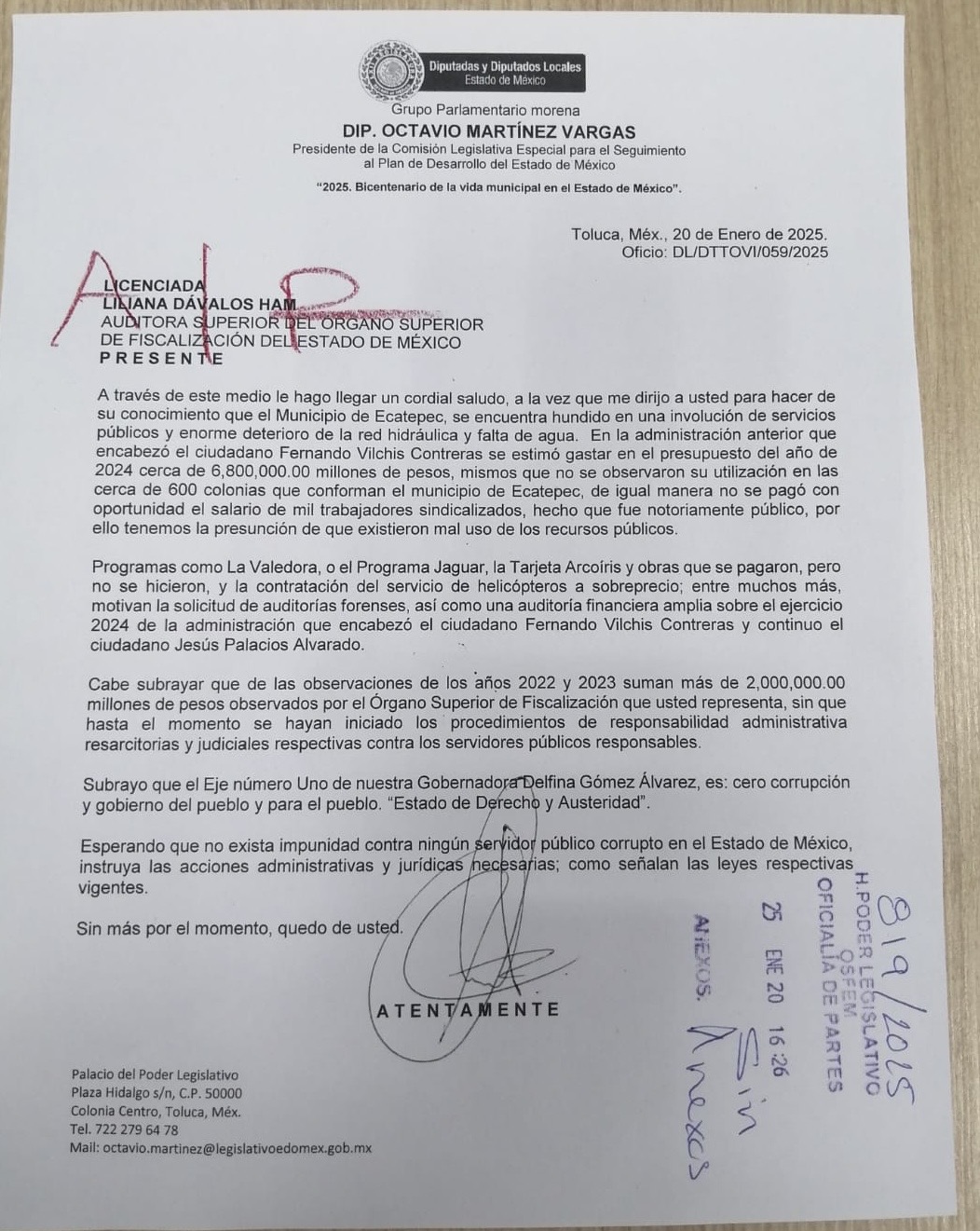 Por la izquierda2: El diputado local de morena, Octavio Martínez Vargas, solicitó de manera formal al Órgano Superior de Fiscalización del Edomex (OSFEM), llevar a cabo forenses a la gestión de Fernando Vilchis Contreras, además de una auditoria financiera amplia sobre el ejercicio 2024, en el periodo que continuó Jesús Palacios Alvarado.