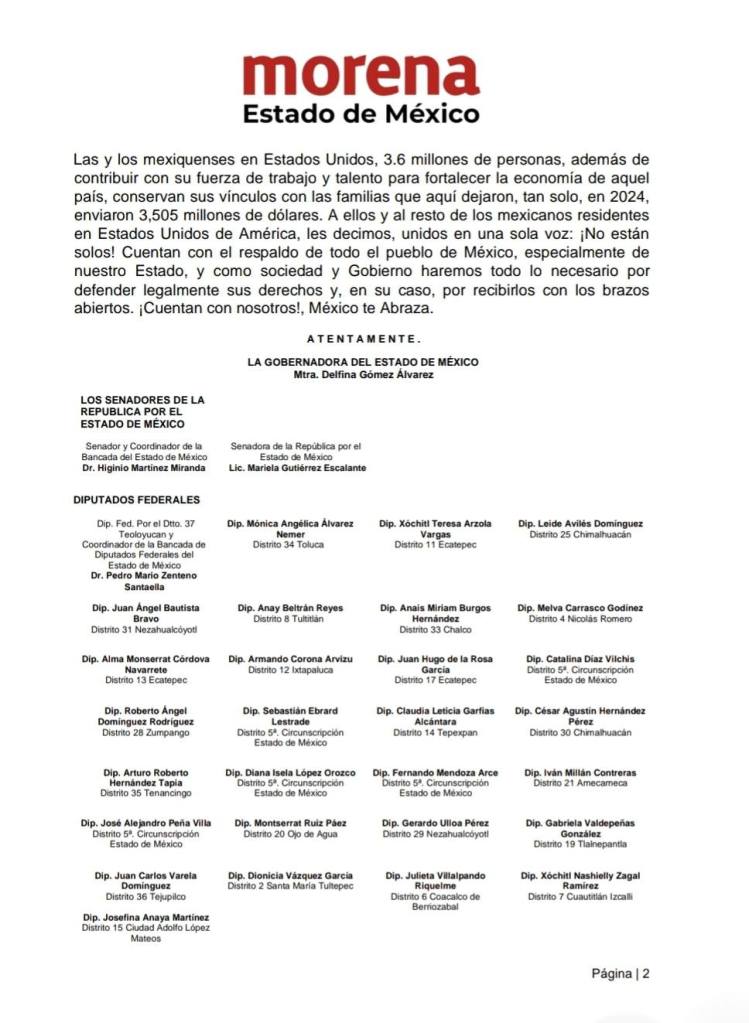 Tan solo en 2024, enviaron tres mil 505 millones de dólares. “A ellos y al resto de los mexicanos residentes en Estados Unidos de América, les decimos, unidos en una sola voz: ¡No están solos! Cuentan con el respaldo de todo el pueblo de México, especialmente de nuestro Estado, y como sociedad y Gobierno haremos todo lo necesario por defender legalmente sus derechos y, en su caso, por recibirlos con los brazos abiertos”, se lee en los documentos referidos.