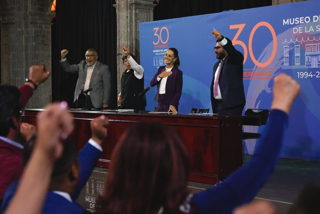 En la reunión que encabezó Sheinbaum estuvieron presentes, en un presidium, la gobernadora Delfina Gómez y Horacio Duarte, el secretario General de Gobierno.