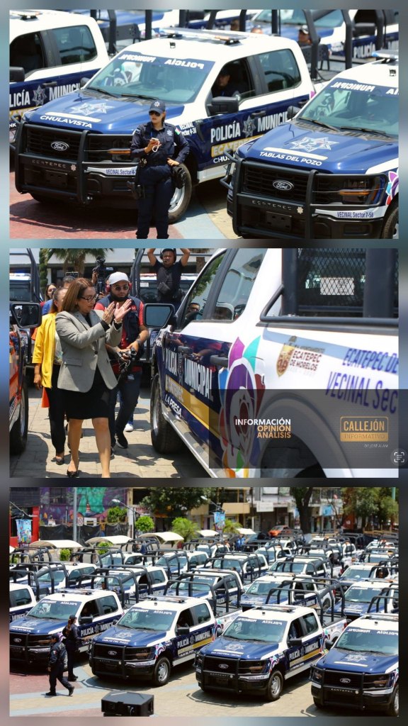 Por la izquierda: La presidenta Municipal de Ecatepec, Azucena Cisneros Coss, entregó las primeras 80 patrullas de un total de 394, uniformes y reconocimientos económicos a policías municipales, con lo cual -dijo- se avanza en la transformación de la corporación, cuyos principales objetivos son la cercanía con la gente y hacer de Ecatepec un municipio de paz.